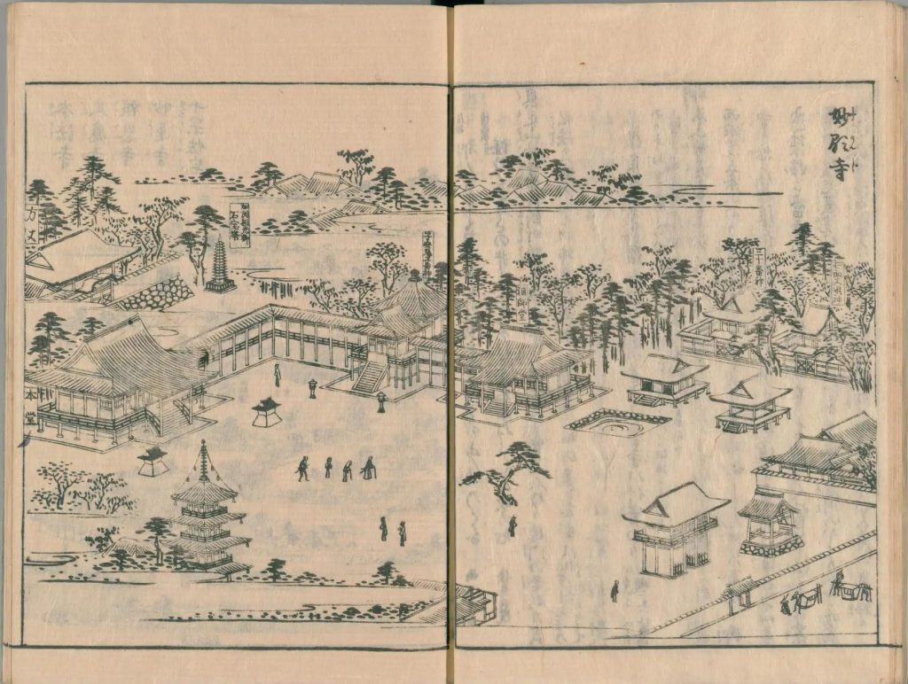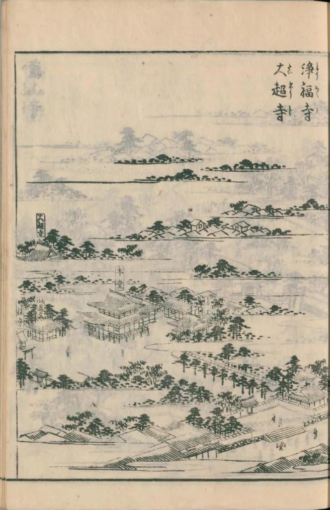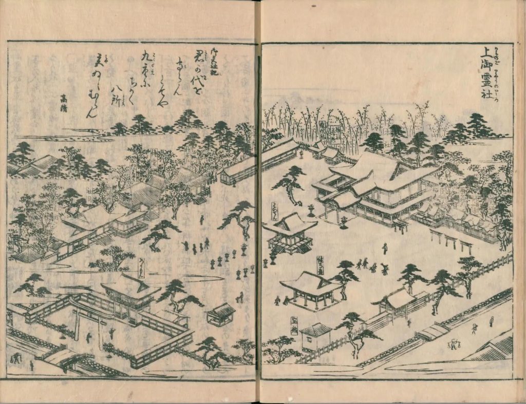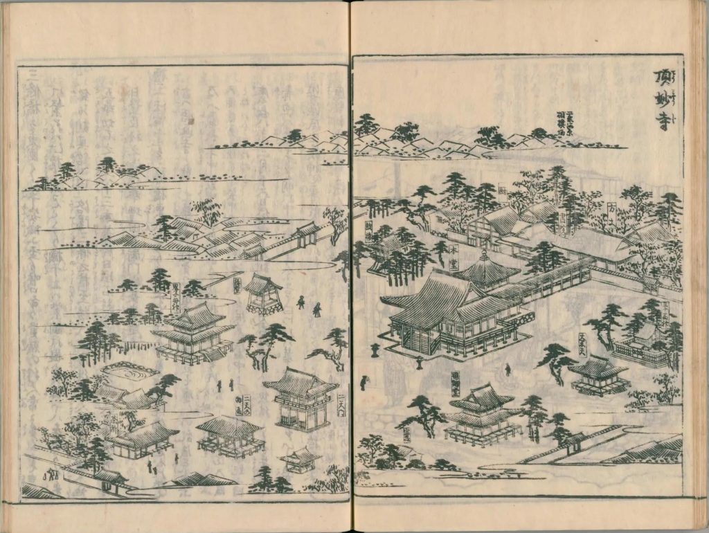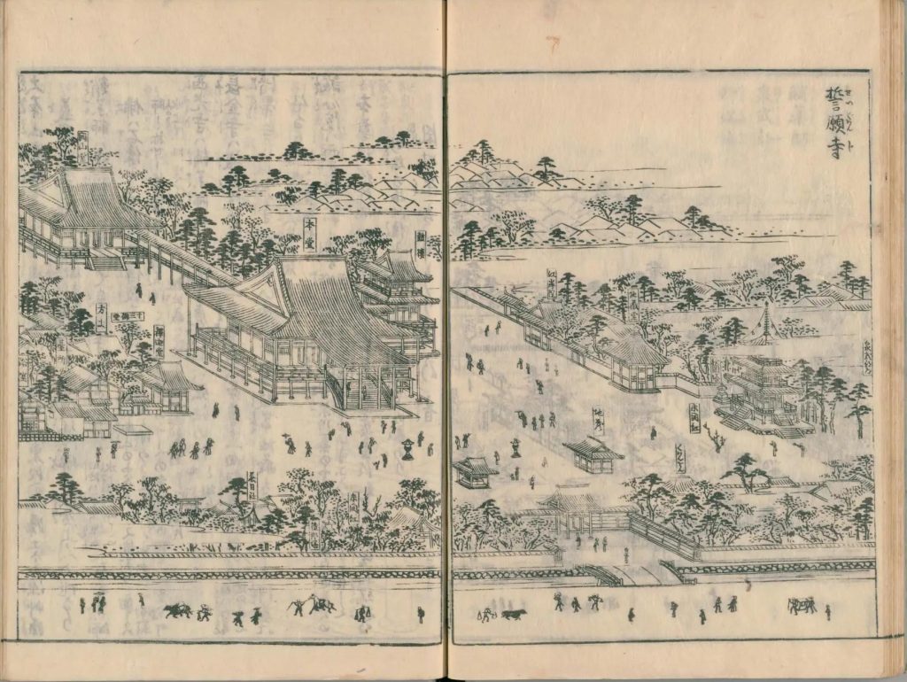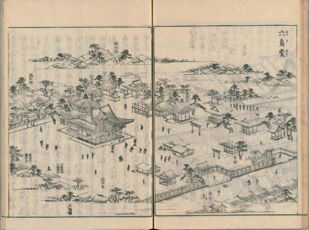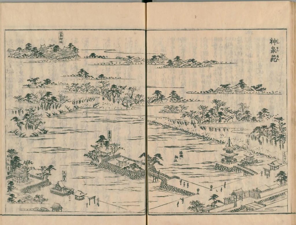 - 図中に境地広大なる所は究て細画なり。狹少なる神祠小堂は又尓らず。故に圖毎に人物あり。形容至って微少なる人物は其地、広大としるべし。形容微少ならざるは、境地狹少なり。譬ば加茂社と野宮との境地を知らするの便りなり。