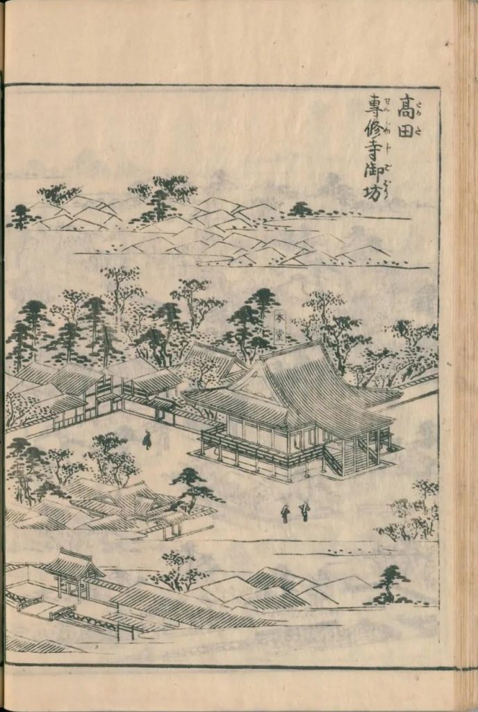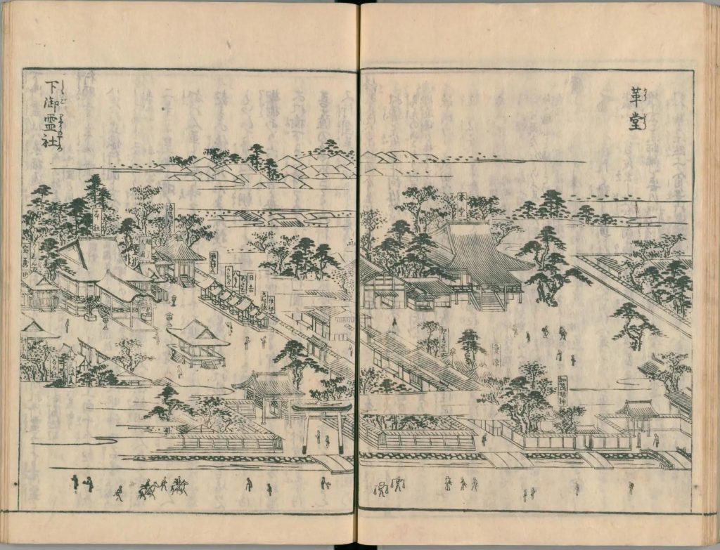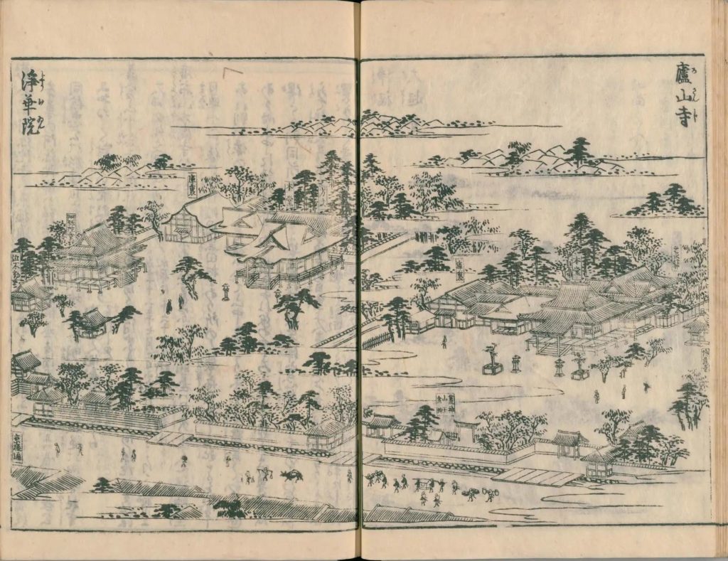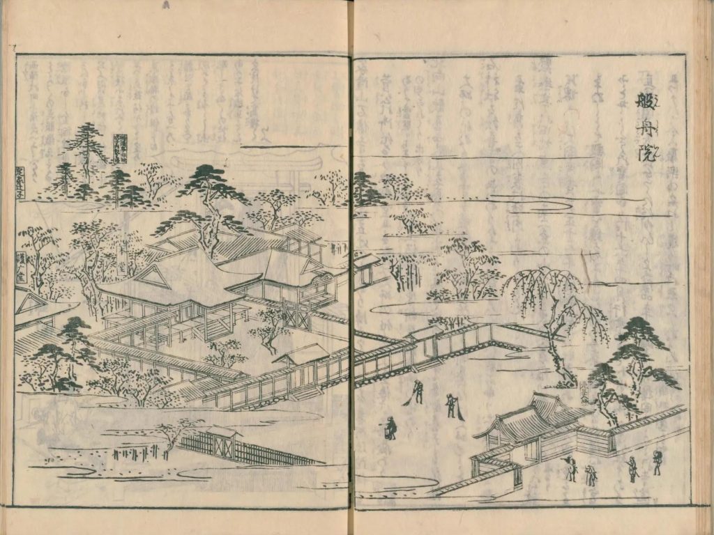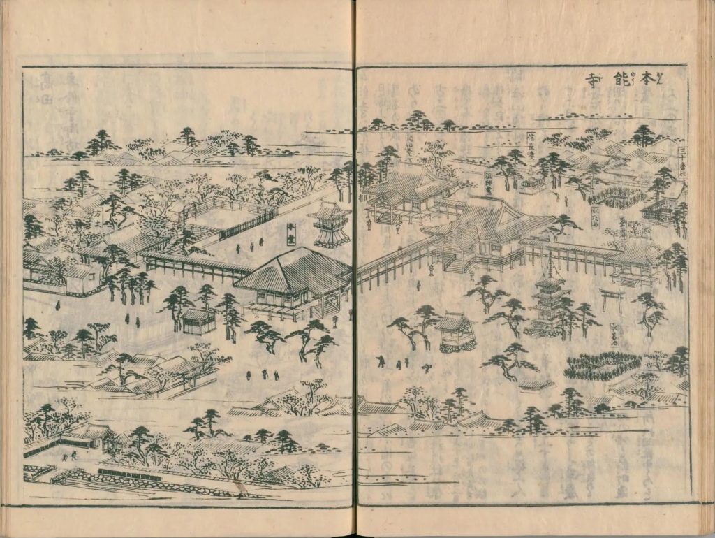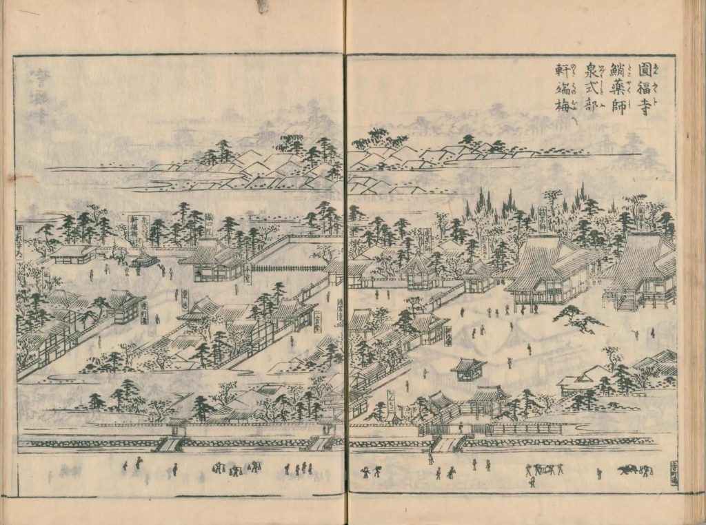 - 図中に境地広大なる所は究て細画なり。狹少なる神祠小堂は又尓らず。故に圖毎に人物あり。形容至って微少なる人物は其地、広大としるべし。形容微少ならざるは、境地狹少なり。譬ば加茂社と野宮との境地を知らするの便りなり。