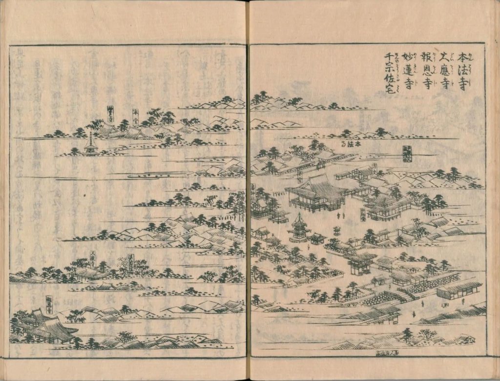 叡昌山本法寺は大応寺の南にあり、法華宗にして開基は日親上人なり。本堂の額は光悦書す。初は綾小路の西にあり、中頃一条堀川の西に移し、又天正年中に今の地にうつす。