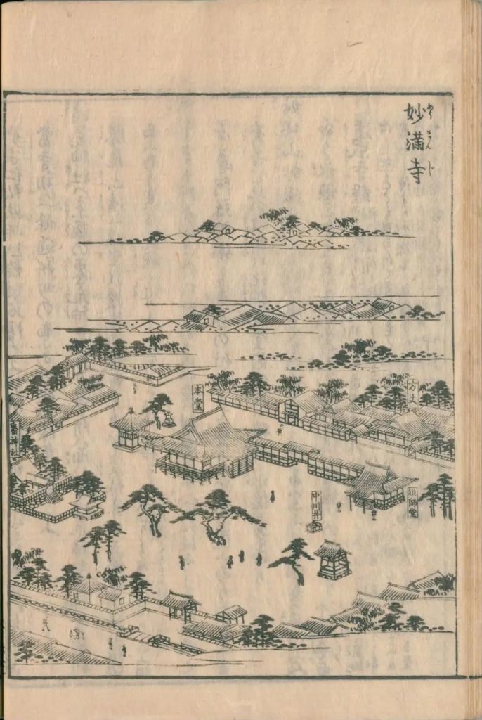 妙塔山妙満寺は京極通二条の南にあり、法華宗にして開基は日什上人なり。永徳三年五月に建立あり、元の地は綾小路堀川の西にあり。〔今妙満寺町といふ〕 道成寺鐘〔 当寺にありこれ紀州日高道成寺の鐘なり。銘あり、兵乱によつて伽藍回禄後所々にうつし、遂に天明十六年五月に紀州新宮の某当寺に寄付す、然れども瑾あつて音響遠く至らず、故此鐘を鋳改んとて砕んとするに、大に震動し鐘より火焔出る、衆僧これに驚て此事を止て、新に一鐘を鋳たり、則此鐘は堂内に蔵む、初は龍頭の下にひゞきありしが次第に癒て今は平なり〕 中川の井〔堂前にあり洛陽七井の中なり〕