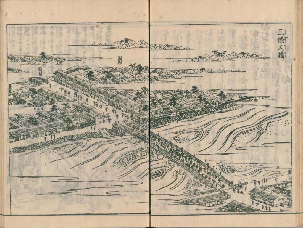 三条橋は東国より平安城に至る喉口なり、貴賎の行人常に多くして、皇州の繁花は此橋上に見えたり、欄干には紫銅の擬宝珠十八本ありて、悉銘を刻。其銘に曰、洛陽三条で之の橋、至二後代一化二度往還人一、磐石之礎入レ地、五尋切石之柱六十三本、蓋於二日域一石柱濫觴乎、天正十八年庚寅正月日、豊臣初レ之御代奉増田右衛門尉長盛 造レ之。