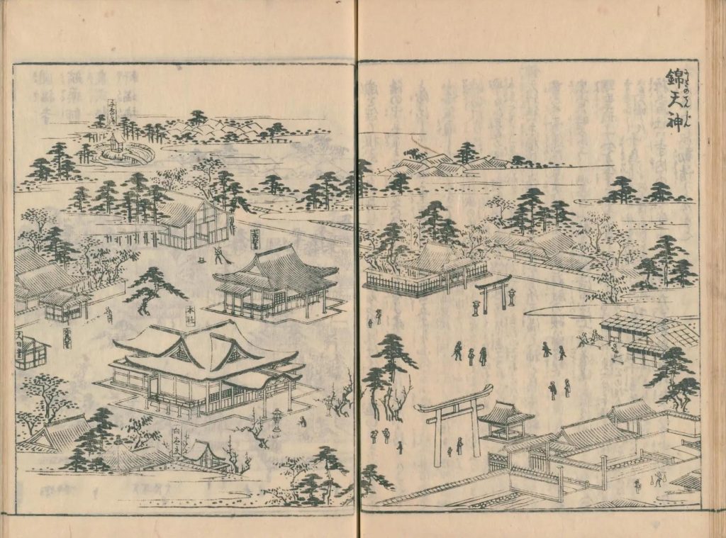 錦天神社は京極錦小路東行当にあり、祭る所天満天神なり。鳥居の額は天満宮と書して、青蓮院尊英法親王の筆なり。拝殿の額は宝鏡 寺宮理秀尼公の筆とぞ。宗旨は時宗にして、紫苔山歓喜光寺河原院 六条道場号す、開基は一遍上人の甥聖戒上人なり、元亨三年二月十五日寂す。〔当寺の旧地は東六条本願寺の境内枳殻の馬場なり、左大臣融公住給ひし河原院を改て寺となし、六条道場とす〕千鳥が池〔当寺庫裏の後にあり、河原院にありしをこゝにうつす〕 塩竃社〔千鳥が池の中島にあり、祭る所河原左大臣なり〕抑当社は寺内の鎮守にして、古は左大臣融公を祭れり、中頃より天満宮を勧請しけるなり。