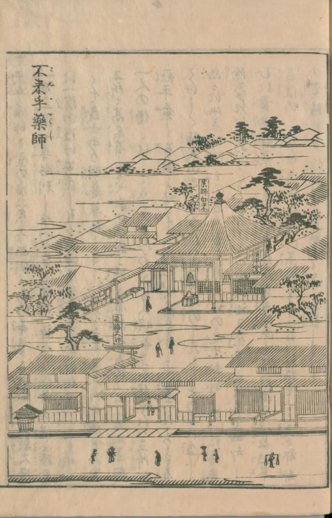 蛸薬師は永福寺と号して、円福寺の境内にあり。〔旧地は三条室町なり、水上の薬師といふ〕本尊薬師仏は石像にして、長二尺伝教大師の作なり。〔旧比叡山の北谷にあり、又鮹薬師と号するは、旧地に沢あり、是によつて都下の人沢薬師と称せしを、後世誤つて蛸薬師といふ風俗せり。いにしへの堂の梁の銘には、三条室町水上の薬師堂に記し侍る。○鯉地蔵は堂の前にあり、由来繁げきによつて略す〕